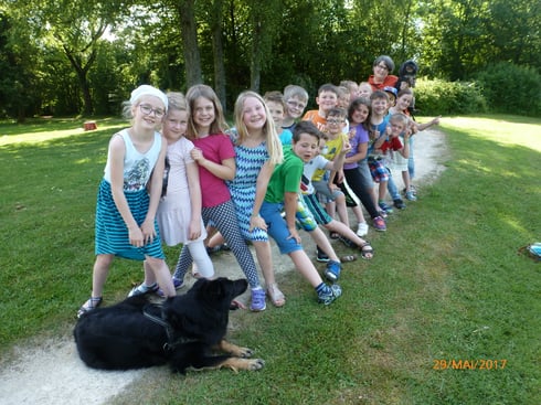 Gleich zu Beginn der Woche besuchte uns Frau Payer-Rönnebeck mit ihren beiden Hunden Elli und Bobby. Pudeldame Elli ist mit ihren 17 Jahren schon eine alte Hundedame. Wäre sie ein Mensch, wäre sie bereits 119 Jahre alt. Für dieses Alter ist sie noch sehr quirlig und holte fleißig das Stöckchen, welches die Kinder abwechselnd werfen durften.