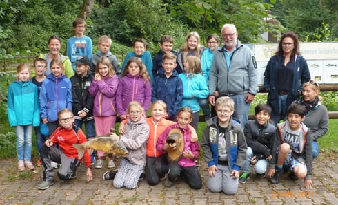 Zum Abschluss des Themas Wasser besuchten die Kinder der Klasse 3 den Hagenbucher Teich. Dieser diente früher als „Löschteich“ für die Feuerwehr. Heute finden sich darin viele Lebewesen wieder, zum Beispiel Hechte, Karpfen… Herr Ziegler vom Fischereiverein berichtete sehr anschaulich, was im und rund um den Teich alles lebt und vor allem, wie diese Tiere leben. Er stellte Zusammenhänge her (wer ist von wem abhängig) und beantwortete viele Fragen.