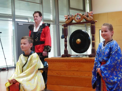 Spontan ausgewählte Tänzer vollführten einen beeindruckenden Säbeltanz und das Publikum, bestehend aus den anderen Klassen der Grundschule, Lehrerinnen und Eltern, unterstützte den Prinzen Kalaf beim Lösen der drei Rätsel, damit der Liebe zu Turandot nichts mehr im Wege stand.