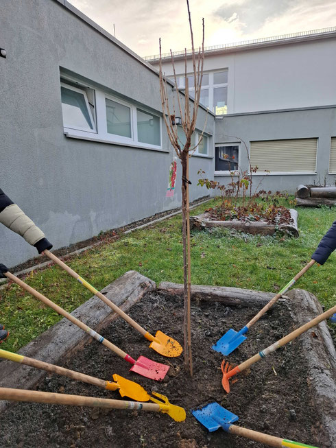 Also hat die Klasse 3a der Grundschule fleißig ein Beet vorbereitet und am 3.12.25 ein Johannisbeerbäumchen gepflanzt.